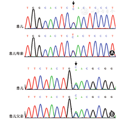 入院后予以持续静脉输注葡萄糖,糖速5 mg/(kg·min),监测血糖维持在1.8~3.6 mmol/L,逐步上调糖速至10 mg/(kg·min),血糖2.1~5.5 mmol/L。入院5 d因血糖不能维持静脉输注氢化可的松10 mg/ (kg·d),血糖波动在3.3~4.2 mmol/L,共输注8 d,改为口服醋酸泼尼松片1~2 mg/(kg·d),口服8 d后停药。停药第2天患儿血糖1.8 mmol/L,再次静脉输注氢化可的松10 mg/(kg·d),监测血糖正常,改为口服醋酸氢化可的松片每日15 mg(7am)、10 mg(3pm)、10 mg(10pm)共3次。患儿入院22 d及39 d出现发热,体温最高38.7 ℃,完善腰椎穿刺检查排除中枢系统感染,给予复达欣、青霉素钠抗感染治疗。入院30 d监测头围34 cm,较入院时头围缩小,体重3 500 g。经家属知情同意取患儿及父母静脉血行基因检测。生后44 d签字自动出院。出院后10 d因"呕吐伴腹泻3 d"收治本院重症监护室,予以禁食、补液、抗感染等对症治疗后症状好转,转内分泌病房治疗,给予持续鼻饲泵奶,仍偶有呕吐,生后60 d自动出院。出院后随访患儿已死亡,时间及原因不详。