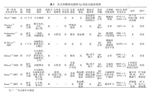 | Eklund[9]2005 | 男 | 不详 | 小头畸形,长瘦脸,鼻梁突出,内眦赘皮,大耳 | 有 | - | 有 | 肺炎 | 无 | Ⅺa因子减少 | IgG减少 | 正常 | 824G>A,29G del | 无 | 存活 |
