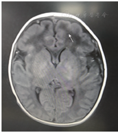 患儿男,生后4 d余,因"吸吮力弱、吃奶差3 d伴皮肤黄染1 d"入院。患儿系第2胎第2产,胎龄41周顺产娩出,无窒息史,出生体重3 900 g。生后吸吮力弱,吃奶少,第3天出现皮肤黄染,遂收入院。父母非近亲结婚,无特殊疾病家族史。入院查体:生命体征平稳,体重3 610 g,头围34.5 cm,身长52 cm,哭声低,皮肤中度黄染,心肺腹查体无异常。四肢肌张力低,原始反射减弱。入院时血清总胆红素262.5 μmol/L。入院2 h患儿出现呼吸减慢,经皮血氧饱和度低于0.90,予以鼻导管吸氧。血常规、C反应蛋白正常,血氨、血乳酸正常,TORCH-IgM阴性,甲状腺功能正常,胸部X线片、头颅B超、心脏B超正常,脑脊液及血尿串联质谱检测正常。头颅磁共振成像回报T1像发现额部稍低信号影(图1)。入院后行遗传病全外显子组家系检测,结果回报:父母基因检测均无异常,患儿为PURA(NM-005859.4)Exon1:c.98dupG;p. (Gly34fs)移码突变,提示5号染色体长臂3区1带PURA基因发生了移码突变,诊断PURA综合征。住院期间患儿吸吮力进行性减弱,需管饲喂养,呼吸浅慢、不能离氧,少哭少动,四肢肌张力尤其双下肢肌张力明显低下,家长考虑预后差,自动出院。出院后电话随访,曾在外院行高压氧治疗,但效果不明显,于生后1个半月余死亡。