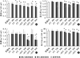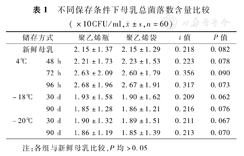 收集2018年1~3月吉林省妇幼保健院60例产后30 d健康产妇的新鲜母乳各120 ml,每例产妇的母乳均等分为15份,1份为新鲜母乳,7份分装在聚乙烯储奶袋中,7份分装在聚乙烯储奶瓶中。储奶袋和储奶瓶中母乳分别保存于4℃(各3份)、-18℃(各2份)和-20℃(各2份)冰箱,4℃分别保存48、72、96 h,-18℃和-20℃分别保存30 d和90 d。检测新鲜母乳及不同保存方式母乳中细菌菌落总数、热卡、脂肪、蛋白质、乳糖、免疫活性因子(肿瘤坏死因子α、白细胞介素6、白细胞介素10、乳铁蛋白)含量等。