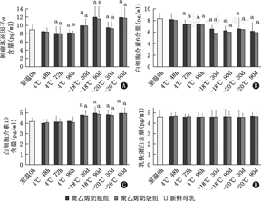 4℃冷藏母乳分别保存48、72、96 h,-18℃冷冻母乳和-20℃冷冻母乳均分别保存30、90 d。检测前室温复温,用KJ-202振荡器混匀后进行成分分析,样本处理及检测过程参考文献[3]。