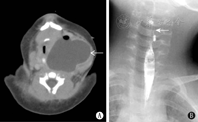 综上所述,新生儿生后如表现为左侧颈前区无症状性肿物,尤其是肿物大小随进食变化时,需考虑PSF。囊肿感染后常合并呼吸困难,应积极抗感染治疗。在超声筛查的基础上,CT/MRI应作为新生儿PSF的首选诊断手段。新生儿PSF感染控制后即可进行手术治疗,直视下手术与内镜辅助术均可获得满意效果。