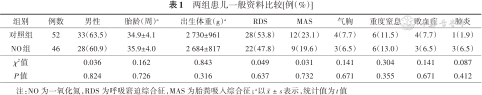 | 组别 | 例数 | 男性 | 胎龄(周)a | 出生体重(g)a | RDS | MAS | 气胸 | 重度窒息 | 败血症 | 肺炎 |