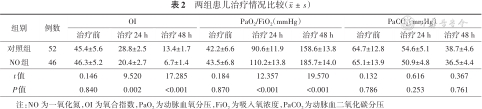 两组患儿治疗前OI值、PaO2/FiO2、PaCO2比较差异无统计学意义(P>0.05);治疗24 h、48 h后NO组OI值较对照组明显下降,差异有统计学意义(P<0.05);NO组治疗24 h时PaO2/FiO2 明显高于对照组,48 h时升高更明显,差异有统计学意义(P<0.05);两组患儿治疗24 h、48 h时PaCO2比较差异无统计学意义(P>0.05)。见表2。
