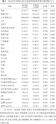 接受NO治疗的46例患儿中,成功组31例,失败组15例;两组患儿性别、胎龄、出生体重、剖宫产比例、胎膜早破、羊水Ⅲ度污染、孕母妊娠高血压疾病、产前规范使用激素、呼吸窘迫综合征、胎粪吸入综合征、重度窒息、败血症、气胸、坏死性小肠结肠炎、脑室内出血、NO起始及最高剂量、酸中毒、血糖、血钙等方面比较,差异均无统计学意义(P>0.05);失败组宫内窘迫发生率、治疗前OI值、合并肺出血、NO吸入时间和机械通气时间高于成功组,高频振荡通气(high-frequency oscillation ventilation,HFOV)、生后PS应用比例低于成功组,差异有统计学意义(P<0.05)。见表3。