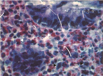 11例电子结肠镜检查均可见直肠结肠黏膜充血、水肿,肠黏膜糜烂8例,黏膜出血、溃疡灶各5例(图1)。组织病理学改变表现为肠黏膜炎性改变,结肠黏膜间质可见炎性细胞浸润,局灶区间质可见嗜酸性粒细胞浸润:5~30个/HPF不等(图2)。
