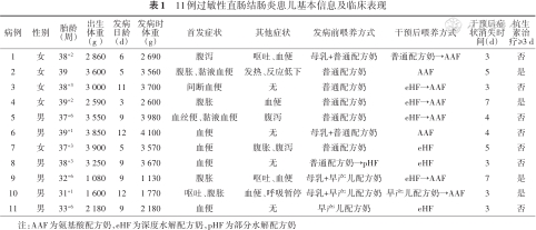 | 11 | 男 | 33+6 | 2 180 | 9 | 2 180 | 血便 | 无 | 早产儿配方奶 | eHF | 3 | 否 |