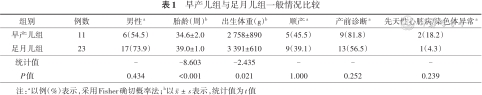 | 足月儿组 | 23 | 14(60.9) | 9(39.1) | 16(69.6) | 4(17.4) | 3(13.0) | 15(65.2) | 1(0,11) |