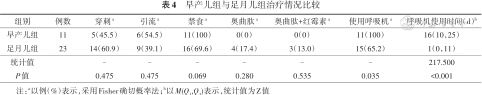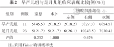 | 早产儿组 | 11 | 6(54.5) | 34.6±2.0 | 2 758±890 | 5(45.5) | 9(81.8) | 2(18.2) |