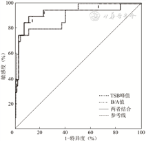综上,TSB峰值、B/A值均可预测新生儿ABE,两者联合预测效能更高,可有效识别极重度高胆红素血症中可能发生ABE的患儿,有助于积极采取干预措施,避免胆红素脑病发生。