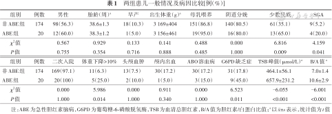 此外,本研究中ABE组入院体重下降>10%、患G6PD缺乏症的比例明显高于非ABE组,与国内文献报道一致[25, 26]。本研究还发现少数民族更易发生ABE,ABE组的13例少数民族患儿均来自广西,其中8例为G6PD缺乏症,与国内既往研究结果一致[6],因此需积极开展G6PD缺乏症筛查,以减少少数民族地区新生儿胆红素脑病的发生。本研究中ABE组小于胎龄儿占比高于非ABE组,可能与胎儿宫内相对缺氧、导致促红细胞生成素增加进而红细胞生成增加有关[27]。