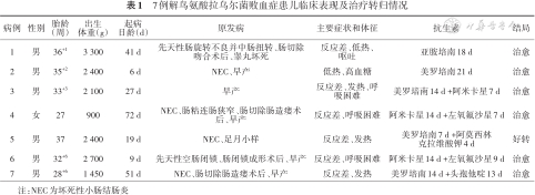 研究期间共确诊7例患儿,男6例,女1例,早产儿6例,足月小样儿1例。反应差6例,发热5例,呼吸困难3例。合并坏死性小肠结肠炎4例,先天性肠旋转不良、先天性空肠闭锁、肠粘连肠狭窄各1例,4例有手术史。白细胞增多3例,白细胞减少1例,均有血小板减少及炎性指标升高。7例患儿均治愈或好转出院。共纳入4篇文献4例新生儿,男3例,女1例,早产儿2例。皮肤潮红、呼吸困难各3例,发热2例,反应差1例。1例因先天性心脏病手术治疗。白细胞减少2例,白细胞增多1例,血小板减少2例,炎性指标升高3例。1例因感染性休克死亡,其余3例均治愈或好转出院。