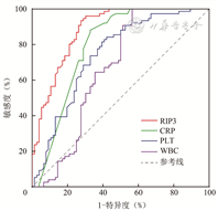 RIP3是一类具有丝氨酸/苏氨酸激酶活性的受体相互作用蛋白家族成员之一,其N末端结构域与其他家族成员类似,但C末端具有独特的结构域[9],临床研究提示血浆RIP3变化与严重创伤或脓毒症并发急性呼吸窘迫综合征、急性肾损伤、心力衰竭及冠状动脉疾病相关[10, 11, 12, 13]。因此,血浆RIP3变化具有潜在临床应用价值。