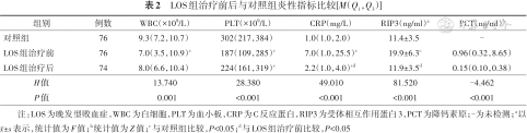 LOS组治疗前WBC、PLT均低于对照组,CRP、血浆RIP3高于对照组,差异均有统计学意义(P<0.05);LOS组治疗后WBC、PLT较治疗前升高但差异无统计学意义(P>0.05),而CRP、PCT、血浆RIP3较治疗前下降,差异有统计学意义(P<0.05)。见表2。