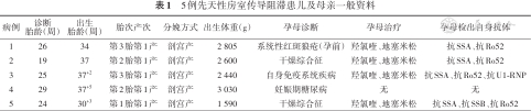 | 5 | 24 | 30+3 | 第1胎第1产 | 剖宫产 | 1 590 | 干燥综合征 | 羟氯喹、地塞米松 | 抗SSA、抗SSB、抗Ro52 |