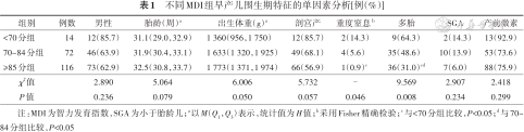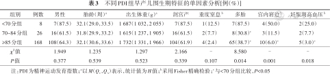 2.PDI影响因素分析:与其他两组相比,PDI<70分组宫内窘迫、母亲妊娠期高血压和多胎比例较高,差异有统计学意义(P<0.05)。见表3。3组间产前激素使用、母亲绒毛膜羊膜炎、妊娠期糖尿病及SGA情况比较,差异无统计学意义(P>0.05)。