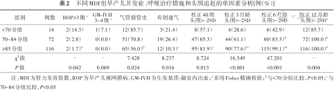 与其他两组相比,MDI<70分组ROP≥3期、气管插管史比例较高,校正年龄40周、3、6、12月龄头围>-2SD比例较低,≥85分组有创通气比例较低,3组间差异有统计学意义(P<0.05)。见表2。3组间RDS 3~4级、BPD、LOS、NEC≥2期、WMD和EUGR发生率差异均无统计学意义(P>0.05)。