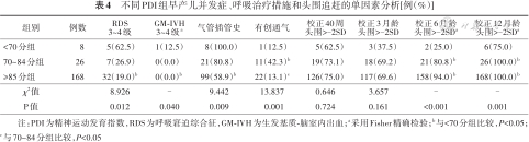 与其他两组相比,PDI<70分组RDS 3~4级、GM-IVH 3~4级发生率、气管插管史比例较高,70~84分组有创通气比例较高,差异有统计学意义(P<0.05);PDI<70分组校正6、12月龄头围>-2SD比例较低,3组间差异有统计学意义(P<0.05)。见表4。3组间ROP≥3期、BPD、LOS、NEC≥2期、WMD和EUGR发生率差异均无统计学意义(P>0.05)。