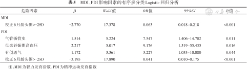 将单因素分析中P<0.10的因素纳入有序多分类Logistic回归和广义线性模型分析,结果显示,校正6月龄头围>-2SD为低PDI和低MDI得分的保护性因素,气管插管史、母亲妊娠期高血压和有创通气为低PDI得分的危险因素。见表5。