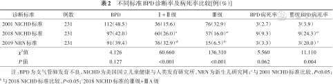 | 诊断标准 | 例数 | BPD | Ⅰ+Ⅱ级 | Ⅲ级 | BPD病死率 | Ⅲ级BPD病死率 |