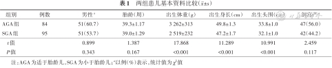 根据2015年《中国不同胎龄新生儿出生体重曲线研制》[11],出生体重低于同性别、同胎龄体重第10百分位的患儿纳入SGA组,出生体重在同性别、同胎龄体重第10~90百分位的患儿纳入AGA组,SGA组与AGA组配对比例为1∶1。