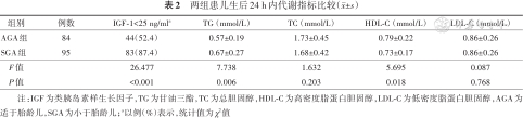 与AGA相比,SGA生后24 h内即呈现IGF-1、HDL-C分泌不足及高TG水平的状态;生后应及时予SGA营养支持,避免发生低血糖,并刺激IGF-1的分泌。