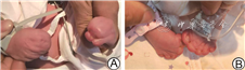 患儿男,生后6 h因“发现手足畸形”收入院。患儿系第1胎第1产,胎龄37+1周因母亲妊娠期高血压、子痫前期剖宫产娩出,出生体重2 700 g。母孕32周产检发现患儿脑室增宽,最宽1.3 mm,行无创产前基因检测提示胎儿13、18、21号染色体异常低风险,外院胎儿头颅MRI无明显异常,家长拒绝羊水穿刺,无家族遗传病史。入院查体:头颅形状略尖,有乒乓球样感,顶枕缝宽约0.7 cm,前囟2.5 cm × 2.5 cm,张力不高,双眼角略下斜,双耳耳位低,未见悬雍垂。左手腕前端可见勺状疑似手掌形态,掌前端可见3个类指状突起,无正常手指关节形态,右手腕前端可见球状突起,可触及骨性结构,无指结构;双足并趾畸形与皮肤融合,各趾末端均可见趾甲,见图1。血尿遗传代谢筛查、染色体核型分析未见异常。头颅MRI提示头颅稍尖、前后径略短,两侧脑室对称、稍宽,余未见明显异常。基因分析:FGFR2基因有1个杂合变异,758号核苷酸由胞嘧啶(C)变为鸟嘌呤(G)(c.758C>G),引起第253号氨基酸由脯氨酸变为精氨酸(p.P253R)。根据美国遗传学与基因组学学会指南,该变异初步判定为致病性变异。患儿父母基因检测该位点均无变异。诊断Apert综合征。常规监测治疗18 d,一般状况、喂养均正常,予以出院。11月龄随访,家长诉患儿不会爬,协助下可短暂独坐,神经行为发育落后于同龄儿。