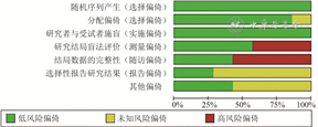 由2位研究者根据《Cochrane干预措施系统评价手册》对纳入研究进行风险偏倚评估,包括随机分配、分配隐藏、研究者和受试者施盲、结局盲法评价、结局指标完整性、选择性报告和其他偏倚等。如遇分歧,则由3位研究者共同探讨裁定结果。使用Jadad评分法评价纳入文献质量,评分>3分为高质量文献。