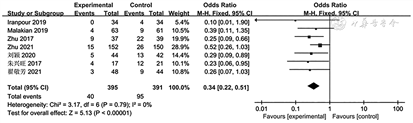 | 并发症 | 异质性 | 试验组(阳性例数/总例数) | 对照组(阳性例数/总例数) | 模型 | 合并效应量 | P值 | ||