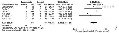 | 气胸/气漏[9,11, 12, 13, 14, 15] | 0 | 0.44 | 11/378 | 10/370 | 固定 | 1.06 | 0.44~2.54 | 0.90 |