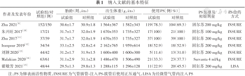 | Zhu 2021[9] | 152/150 | 30.6±1.7 | 30.9±1.8 | 1 564±367 | 1 582±343 | 119(78.3) | 104(69.3) | 固尔苏200 mg/kg | INSURE |