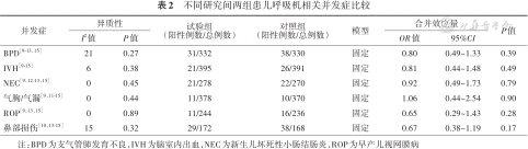 3.并发症发生率:不同研究比较了不同的呼吸机相关并发症,均采用固定效应模型合并,结果显示两组在发生BPD、IVH、NEC、气胸/气漏、ROP、鼻部损伤方面比较差异均无统计学意义,且各研究间同质性良好。见表2。