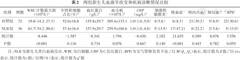 注:NLR为新生儿类白血病反应,WBC为白细胞,CRP为C反应蛋白,BPD为支气管肺发育不良;a以M(Q1,Q3)表示,统计值为Z值;b以±s表示,统计值为t值;c以例(%)表示,统计值为χ2值