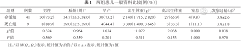 | 死亡组 | 9 | 8(88.9) | 39.0(32.5,39.0) | 4(44.4) | 3 300(1 490,3 645) | 3(33.3) | 1(11.1) | 3.8±1.8 |