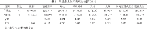 50例患儿表现为腹胀49例、精神萎靡30例、呕吐27例、呼吸困难21例、发绀18例、发热14例、肠鸣音减弱或无肠鸣音37例、腹壁潮红17例。死亡组呼吸困难、发热比例高于存活组,差异有统计学意义(P<0.05);两组其他临床表现比较,差异无统计学意义(P>0.05)。见表2。
