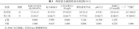 | 组别 | 例数 | WBC<5×109/L或>20×109/L | 血小板减少 | C反应蛋白>10 mg/L | 降钙素原升高 | pH<7.3 | 乳酸>2.5 mmol/L | 气腹a |