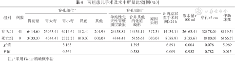两组患儿穿孔部位、穿孔大小、是否合并其他消化道畸形、腹水量>100 ml比例比较,差异无统计学意义(P>0.05);死亡组出现症状至手术时间>24 h及伴肠坏死比例高于存活组,差异有统计学意义(P<0.05)。见表4。