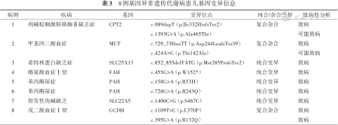 疑似IEM患儿中有33例进行了基因检测,其中8例检出相关基因变异,肉碱棕榈酰转移酶Ⅱ缺乏症、甲基丙二酸血症、戊二酸血症Ⅰ型各1例,上述位点均经父母验证确认为复合杂合变异。其他5例为纯合变异,均符合常染色体隐性遗传病的遗传特征。见表3。