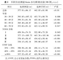 监测手环记录的6 min步行距离显著高于标准测量方法所测距离,差异有统计学意义(P<0.01)。将88例心力衰竭患者按照年龄分为4组,即为30~39岁、40~49岁、50~59岁、60~70岁,分别占14例(15.9%)、26例(29.6%)、36例(40.9%)、12例(13.6%)。在各年龄分组中,监测手环记录的6 min步行距离均较标准方法所测步行距离明显增加(P均<0.05)。将88例心衰患者按照入院NYHA心功能分为Ⅰ~Ⅳ级,其中Ⅰ级8例(9.1%)、Ⅱ级35例(39.8%)、Ⅲ级39例(44.3%)、Ⅳ级6例(6.8%)。NYHA Ⅰ~Ⅲ级中,监测手环测量6 min步行距离均较标准测量方法结果明显增加,差异有统计学意义(P均<0.05)。而在NYHA Ⅳ级的患者中,两种方法所测的6 min步行距离差异无统计学意义(P>0.05)。按照LVEF分为3组,其中35%~39% 27例(30.7%)、40%~49% 17例(19.3%)、50%及以上44例(50.0%)。不同LVEF分组中,手环测量6 min步行距离均显著高于标准方法,差异有统计学意义(P均<0.05)。