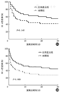 左西孟旦组与对照组院内死亡率的差别无统计学意义(42.1%比55.6%,P>0.05)。Kaplan-Meier生存曲线显示,两组患者30d存活率差别无统计学意义(P=0.145),左西孟旦组90d存活率较对照组有降低趋势,但未达到统计学意义(P=0.069)(图3)。