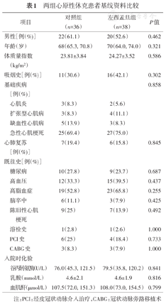 本研究共纳入74例CS患者,对照组36例,左西孟旦组38例。两组患者基线资料差别无统计学意义(P均>0.05)。