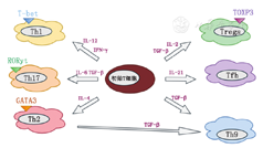 T-bet为T盒子转录因子,Th1为1型辅助性T淋巴细胞,RORyt为视黄酸受体相关孤儿受体γ,Th17为辅助性T细胞淋巴17,GATA3为转录因子,Th2为2型辅助性T淋巴细胞,IL-12为白细胞介素12,IFN-γ为干扰素γ,IL-6为白细胞介素6,TGF-β为转化生长因子β,IL-4为白细胞介素4,IL-2为白细胞介素2,IL-21为细胞介素21,FOXP3为叉头状盒蛋白P3,Tregs为调节性T淋巴细胞,Tfh为滤泡辅助性T淋巴细胞,Th9为辅助性T细胞淋巴9