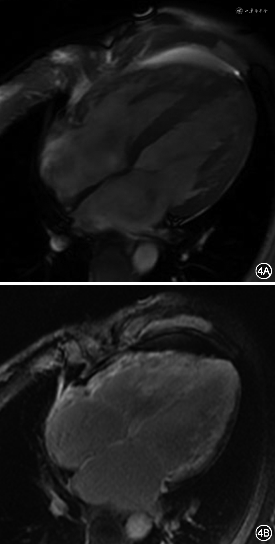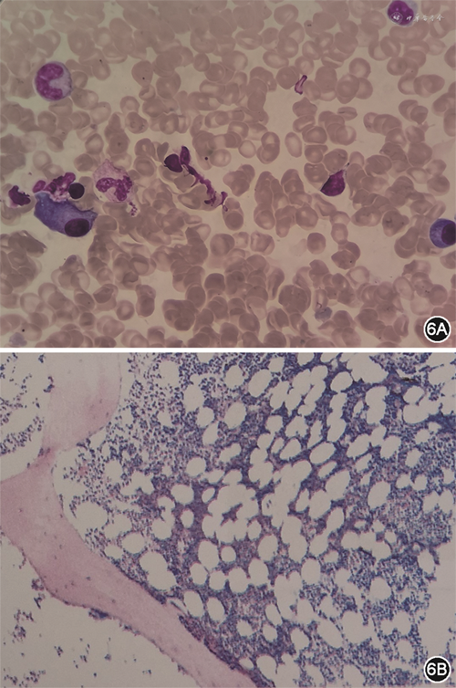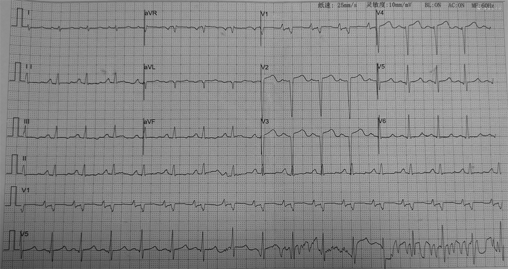 患者男性,41岁,主因“劳力性气短1月,加重1周”于2019年7月17日入院。2019年6月初活动后出现气短,不伴胸闷、胸痛、咽喉部紧缩感及肩背部放射痛,稍事休息可缓解,未诊治。7月10日起气短加重,劳动耐量较前下降,稍活动即感气短,平卧位时亦有气短发作,坐起后可缓解,不伴尿量减少、腹胀及双下肢水肿,为明确诊治来诊。既往史:否认高血压、糖尿病史。2019年4月15日因发热、咳嗽,最高体温为38.4 ℃,于外院行胸部CT示右肺中叶及左肺下叶炎性病灶,部分纤维化,少量心包积液,予抗感染、止咳等治疗后发热、咳嗽缓解。5月10日因左侧头疼伴左半身麻木、呃逆、呕吐行头颅磁共振成像(magnetic resonance imaging,MRI)检查提示急性脑梗死,经改善脑循环、脑保护、稳斑等治疗,无明显后遗症。个人史:吸烟史20年,平均20支/日。入院查体:神志清楚,半卧位,血压100/60 mmHg(1 mmHg=0.133 kPa),颈静脉无怒张,双肺呼吸音清,未闻及干、湿性啰音。心率105次/分,律齐,P2>A2,各瓣膜听诊区未闻及病理性杂音,移动性浊音阴性,双下肢无水肿。心电图:心率96次/分,V1-V4导联R波递增不良(图1)。胸片:双肺纹理增重,心界扩大(图2)。血常规、肝肾功能、电解质、凝血正常范围。心肌肌钙蛋白I(cardiac troponin I,cTnI)0.06 ng/mL,N末端B型利钠肽前体(N terminal-pro B type natriuretic peptide,NT-proBNP)6645.9 pg/mL。动脉血气分析:酸碱度(pH)7.409,二氧化碳分压(PCO2)33.5 mmHg,氧分压(PO2)70.4 mmHg。冠状动脉造影示:未见斑块及有意义狭窄。超声心动图示(图3):双心房增大,左心室、右心室稍大,左心室壁稍增厚,右心室壁厚约3.5 mm。二尖瓣舒张期血流频谱呈双峰,E/A>2。估测肺动脉收缩压约为37 mmHg,左心室射血分数32%,缩短分数15%,左心室舒张末期容积128mL,左心室收缩末期容积87mL,每搏量41mL,心输出量3.18L/min。心脏MRI检查示(图4):双心房增大,左心室壁稍厚,心肌首过灌注示未见明显异常灌注减低或缺损,延迟扫描示室间隔中段可见壁间线状强化,左心室下壁、侧壁及右心室游离壁可见广泛心内膜下强化。心内膜活检及心肌免疫组化示(图5):心肌细胞轻度肥大,心肌细胞间可见淀粉样物质沉积,刚果红染色(+),轻链λ(+),甲状腺素转运蛋白(transthyretin,TTR)(+)。血清免疫球蛋白测定示血清游离轻链(serum free light chain,sFLC)κ 7.67 mg/mL,λ 97.5 mg/mL↑,λ/κ比值(12.7)明显升高。尿本周蛋白:轻链κ 6.63 mg/L,轻链λ 3.66 mg/L。骨髓象及活检(图6):间质内浆细胞散在或灶性浸润(CD138+,κ-,λ+,VS38c+,MUC1散在+,约占15%),局灶可疑有淀粉样物质沉积(刚果红染色弱阳性)。骨髓流式:CD38+CD138+CD27+,轻链λ限制性表达。全身低剂量CT平扫示:颅骨、肩胛骨、肱骨、肋骨、颈、胸椎椎体、骶骨、髂骨、股骨等部位骨皮质变薄,骨小梁稀疏。据上述结果最后确诊为“多发性骨髓瘤、限制型心肌病(心肌淀粉样变)、心功能Ⅳ级(NYHA分级)”。入院后予口服螺内酯20 mg,1次/d,呋塞米10 mg,1次/d,贝前列素钠40 μg,3次/d,比索洛尔片5 mg,1次/d,辅酶Q10,10 mg,3次/d及重组人B型利钠肽治疗,气短症状明显缓解,夜间平卧位休息。后行BD方案(硼替佐米、地塞米松)化疗,化疗第3日患者心功能突发恶化,不能平卧,伴腹胀及双下肢浮肿,遂停止化疗,再次予重组人脑利钠肽及利尿治疗后心能明显改善,可耐受日常活动及平卧位,后症状好转后出院。院外患者规律口服贝前列素钠、螺内酯、呋塞米、比索洛尔等药物治疗,但2020年3月15日于院外猝死。