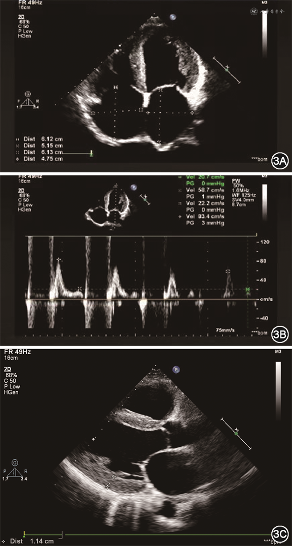 限制型心肌病(RCM)是一种室壁僵硬度升高导致心室舒张功能显著下降为特点的心肌疾病,属混合型心肌病,可分为特发性、家族性或继发于不同的系统性疾病。其诊断依据为:心室限制性舒张功能障碍,伴一侧或双侧心室舒张末期容积或收缩末期容积正常或缩小,室壁厚度正常,并除外缺血性心肌病、心脏瓣膜病、心包疾病和先天性心脏疾病[1]。临床表现为左和(或)右心衰竭,如乏力、气短、体力活动受限、水肿、晕厥、栓塞或各种心律失常等。心电图可有巨大P波、传导阻滞、低电压或R波递增不良表现。超声心动图是最重要的检查手段之一,二维超声心动图其特点为心房增大,心室正常或缩小,部分患者表现为巨大心房。M型超声表现为室壁偏厚,活动明显减低,舒张期左心室内径变小,容积减小,射血分数及短轴缩短率明显减小。多普勒超声可见二尖瓣、三尖瓣关闭不全,二尖瓣口血流呈限制性充盈障碍表现,E峰高尖,E/A>2,E波减速时间缩短,等容舒张时间缩短等。心脏MRI检查是超声心动图的重要补充,除有助于同缩窄性心包炎鉴别外,结合钆显像可明确RCM的分类[2]。本例患者以劳力性气短、不能平卧就诊,化验NT-proBNP水平升高,符合左心功能不全表现。心电图提示左房增大,伴V1-V4导联R波递增不良,超声心动图提示双心房增大、E/A>2,符合限制型充盈障碍表现。超声心动图提示左心室壁可见点状强回声,结合心脏MRI晚期钆增强,心肌活检刚果红染色阳性可确诊RCM、心肌淀粉样变(cardiac amyloidosis,CA)。