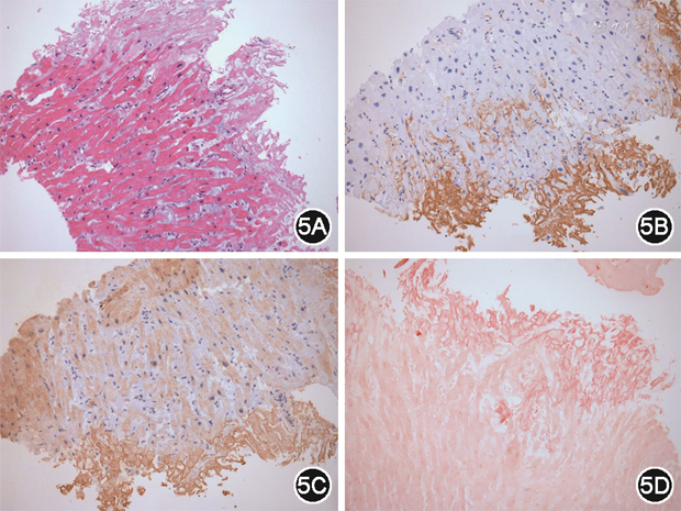 根据淀粉样蛋白前体物质的化学性质不同,CA可以分为:①原发性:又称免疫球蛋白轻链型(AL型)CA,以免疫球蛋白轻链沉积为主,90%患者sFLC升高;②继发性:血清淀粉样蛋白A(AA型)沉积;③遗传性:TTR基因突变致TTR突变体沉积;④老年性:野生型TTR沉积;⑤单纯心房性:心房利钠肽沉积[3]。本例患者虽然心肌组织免疫组化提示免疫球蛋白轻链λ与TTR染色均呈阳性,但考虑不除外TTR免疫组化假阳性,结合其他化验检查结果,考虑为AL型CA。