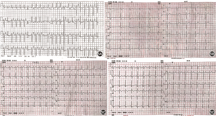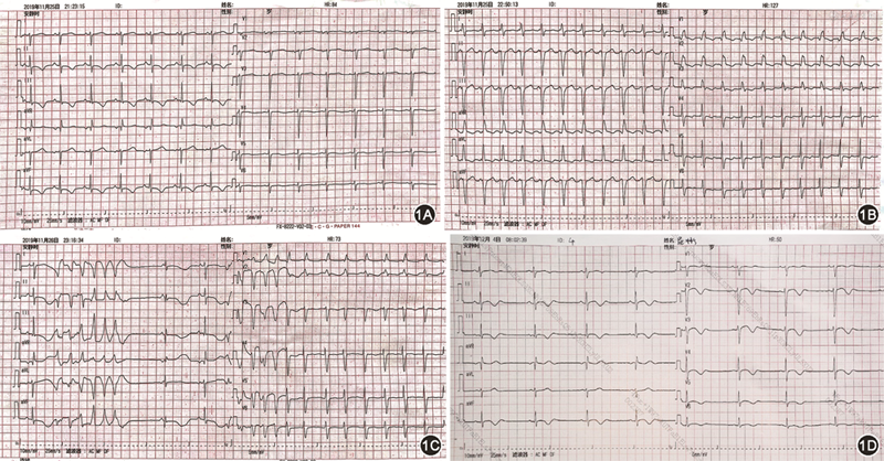 患者男性,14岁,主因“反复心悸2年,胸闷、气短2周,意识丧失1次”于2019年11月25日入院。2年前开始,患者反复于活动时出现心悸,持续1~3天不等,数十天发作一次,因日常生活不受限而未诊治。2周前心悸再发,后因受凉出现胸闷、气短,日常活动耐量明显下降。2天前于县医院就诊,超声心动图提示:全心扩大(具体不详)。1天前转入市医院,住院期间反复发作室性心动过速(室速),胺碘酮治疗效果不佳,电复律3次不成功,于当夜突发意识丧失,心电监护提示心室颤动(室颤),电除颤后转为窦性心律,急诊转入我院。入院查体:体温36.5 ℃,脉搏84次/分,血压107/65 mmHg(1 mmHg=0.133 kPa)(多巴胺5 μg·kg-1·min-1)。右下肺呼吸音低。心尖搏动位于左侧第5肋间锁骨中线外3 cm处,心界叩诊向左下扩大。各瓣膜听诊区未闻及杂音。双下肢无水肿。入院心电图(图1A)提示:窦性心律,心率84次/分,胸前导联R波递增不良,Ⅱ、Ⅲ、aVF导联T波倒置,校正QT间期(corrected QT interval,QTc)502 ms。生化检查示:N末端B型利钠肽前体(N terminal-pro B type natriuretic peptide,NT-proBNP)9 322pg/mL;超敏心肌肌钙蛋白T(high sensitivity cardiac troponin T,hs-cTnT)0.021 ng/mL(参考值范围0~0.014 ng/mL);心肌酶:肌酸激酶(creatine kinase,CK)311 U/L(参考值范围50~310),肌酸激酶同工酶(CKMB)25 U/L(参考值范围0~24);肝功能:谷丙转氨酶(alanine aminotransaminase,ALT)170 U/L,谷草转氨酶(aspartate aminotransferase,AST)76 U/L;肾功能:血肌酐55 μmol/L。血电解质:血钾3.51 mmol/L,血钠136 mmol/L,血镁0.94 mmol/L。初步诊断考虑为重症心肌炎可能,不排除心肌病。