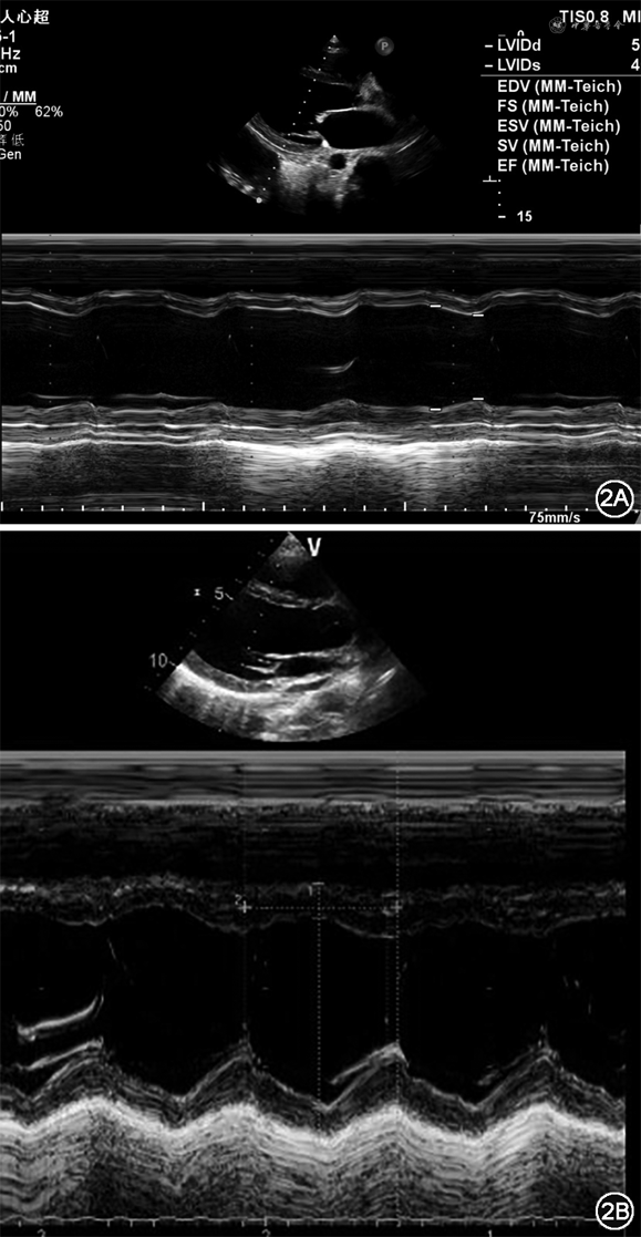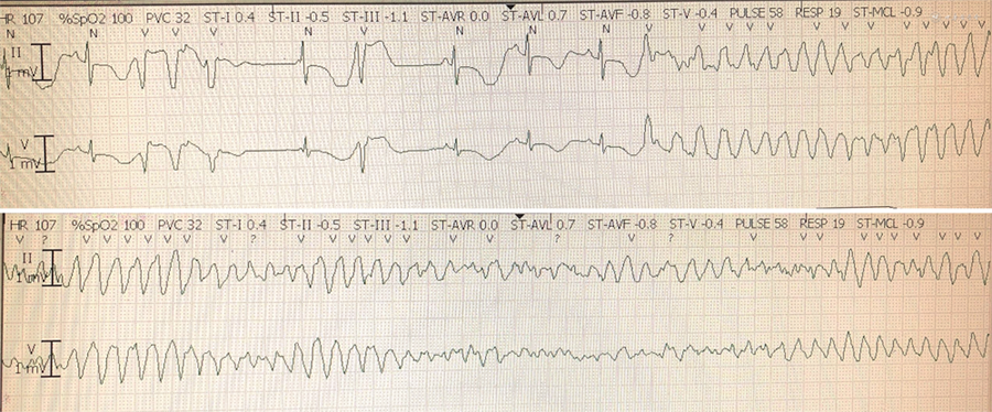住院第2天(11月26日)超声心动图示:左心房前后径(left atrial diameter,LAD)39 mm,左心室舒张末期内径(left ventricular end-diastolic diameter,LVEDD)55 mm,左心室射血分数(left ventricular ejection fraction,LVEF)39%。超声心动图结论:符合心肌受累疾患超声改变,全心增大伴二三尖瓣少量返流,轻度肺动脉高压,少量心包积液(图2A)。床旁胸片提示:全心增大伴双侧胸腔积液(图3A)。26日上午室速再发,心室率130次/分,在静脉基础上加用口服维拉帕米80 mg,3次/d。夜间出现频发室性期前收缩(室早),R on T,随即演变为室颤(图1C和图4),患者抽搐,电除颤1次转为窦性心律,仍见频发R on T室早,后以利多卡因50 mg静脉注射,后以4 mg/min静脉泵入,室早明显减少;即刻查血钾3.84 mmol/L,血钠133 mmol/L,血镁0.99 mmol/L。当天查心电图提示:QTc=541 ms(心率78次/分)。