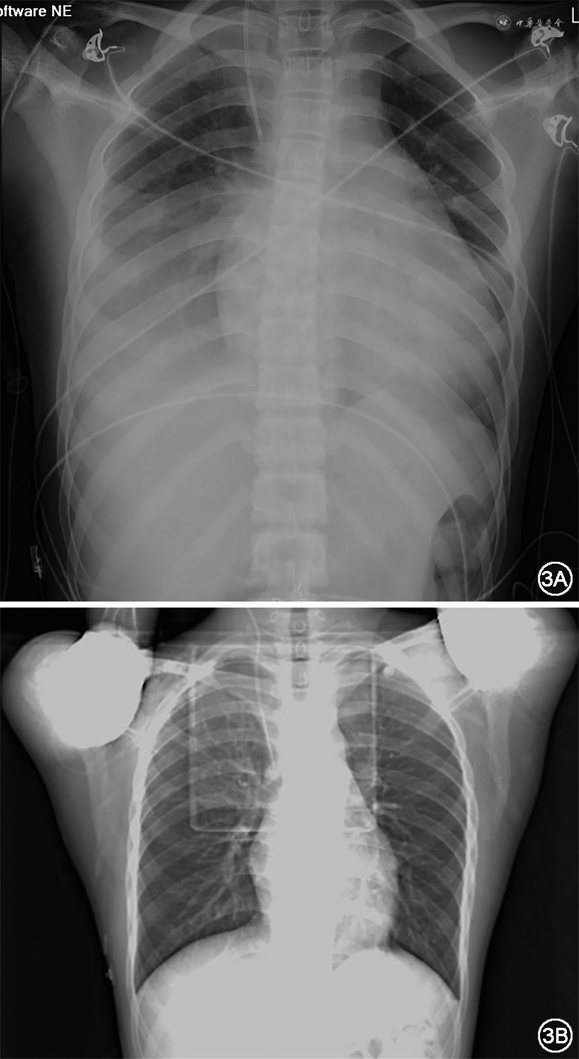 住院第10天(12月4日)安排患者出院,出院时心电图(图1D):QTc=483 ms(心率49次/分)。复查胸片(图3B)提示:双侧胸腔积液消失,心影明显回缩。复查床旁超声心动图示:LVEDD 47 mm,LVEF 49%。NT-proBNP 154.8pg/mL。
