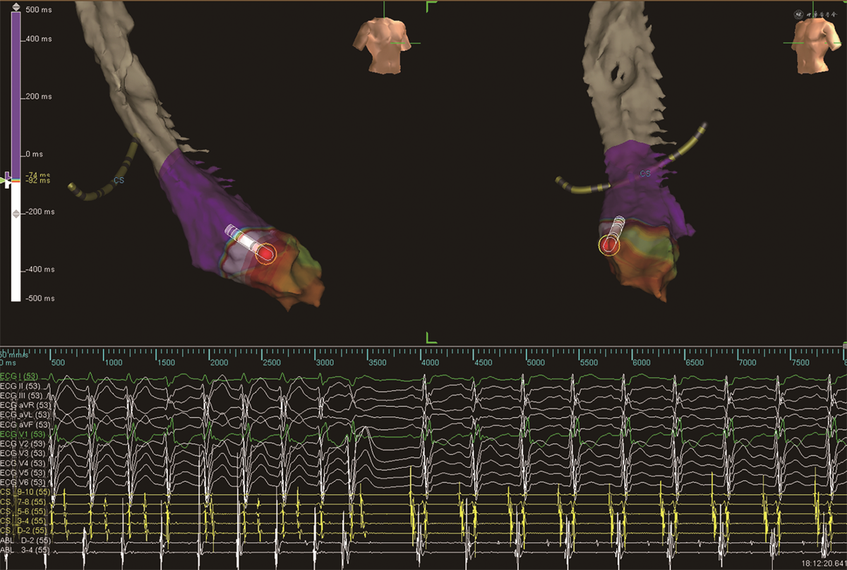 出院后7个月时患者心悸再发,症状同前,复查心电图为室速(图5A),口服维拉帕米80 mg后维持窦性心律(图5B)。为行射频消融术收入院。复查超声心动图示:LAD 24 mm,LVEDD 48 mm,LVEF 74%。复查NT-proBNP 19.92 pg/mL,hs-cTnT 0.010 ng/mL。行电生理标测为左心室间隔偏前室速,频率170bpm,三维标测下送大头电极于左心室间隔偏心尖处消融成功(图6)。术后当天心电图为RBBB(图5C),第二天RBBB消失(图5D),但静息时心率90次/分,出院时继续口服美托洛尔治疗,停用沙库巴曲缬沙坦。