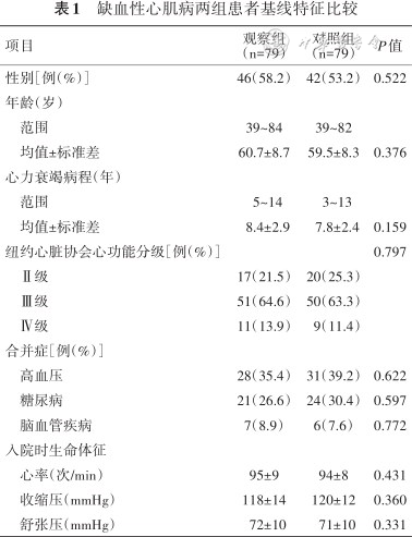 1. 基线特征比较(表1):本研究共纳入158例ICM患者,其中,对照组和观察组各79例。两组患者基线特征比较详见表1,由表1可以看出,两组患者基线特征比较的差异均无统计学意义(P均>0.05)。